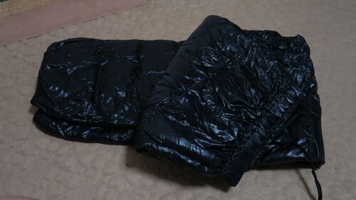 注文したダウンパンツが本日届きました。 500~600mlのペットボトルぐらいの収納袋に収まり非常にコンパクト。 登山にも持って行けるだろう。