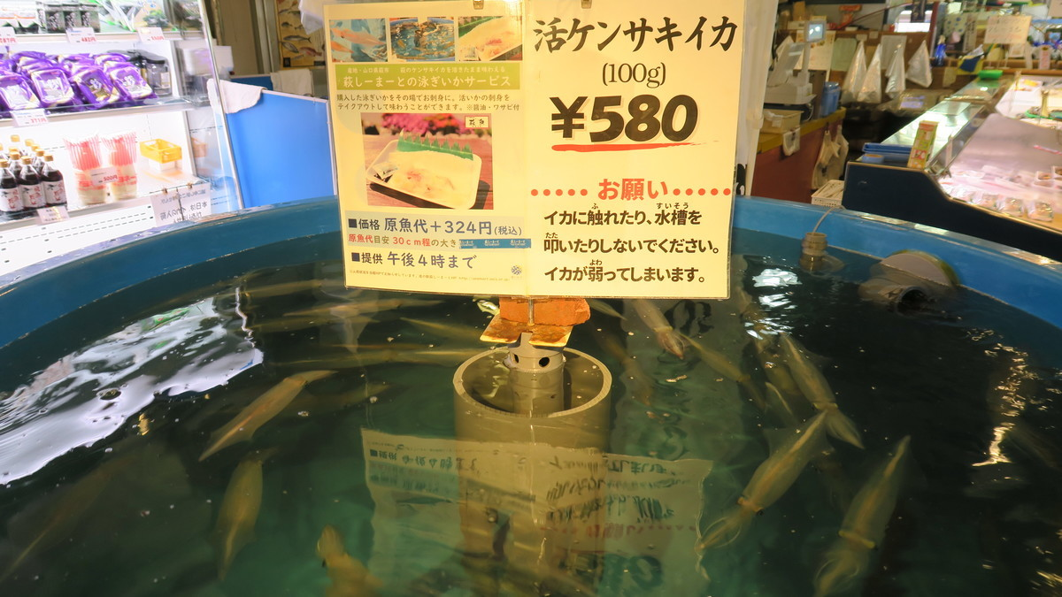 監視している萩市のいか店の活いか。これを狙いに行きます。