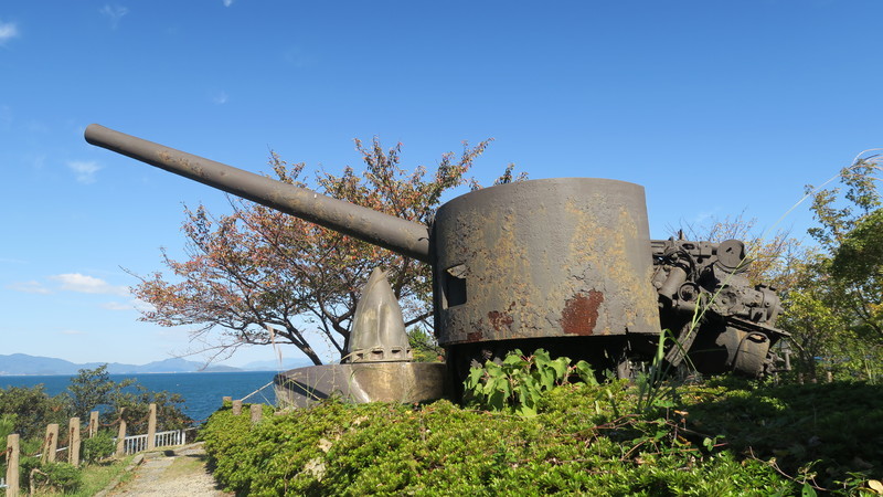 記念館の側の高台には、海底から引き揚げられた副砲などが佇む。