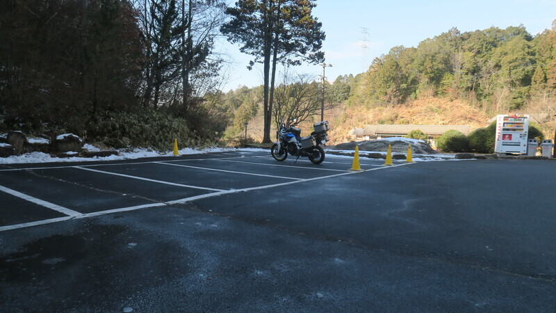 黄色コーンの所がバイク用とあるが、サイドスタンドの辺りは凍っていた。