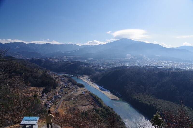 眼下には木曽川、奥には恵那山、左の山々は去年歩いた富士見高原の方だ。
