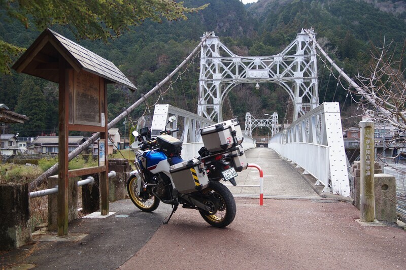 橋の説明看板には二輪車は通れるとある。