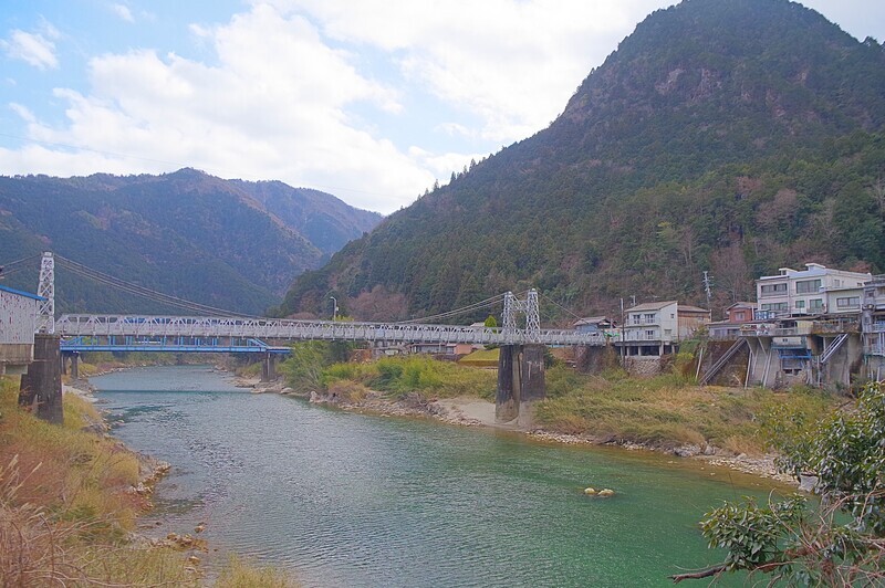 飛騨川に架かるのがこの大正15年に完成した鋼製の吊り橋です。