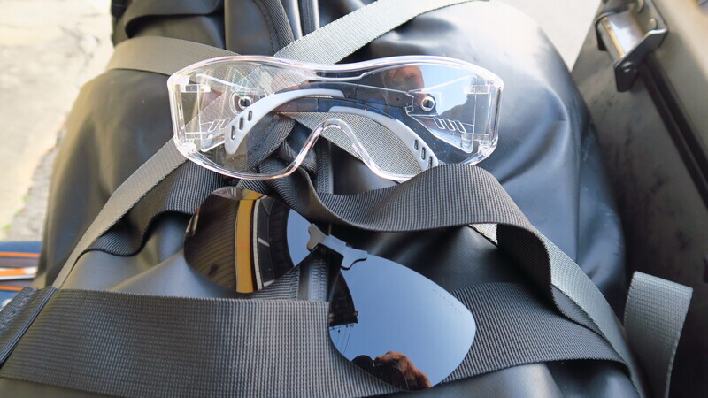 目に風や塵が入ってくるので、夜間用に買ったミドリ安全の防塵ゴーグルもある。