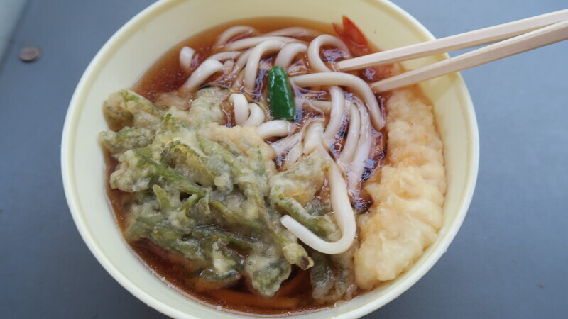うどんはえび天、タラの芽天が入っている。※ハズレだとさつまいも天など。