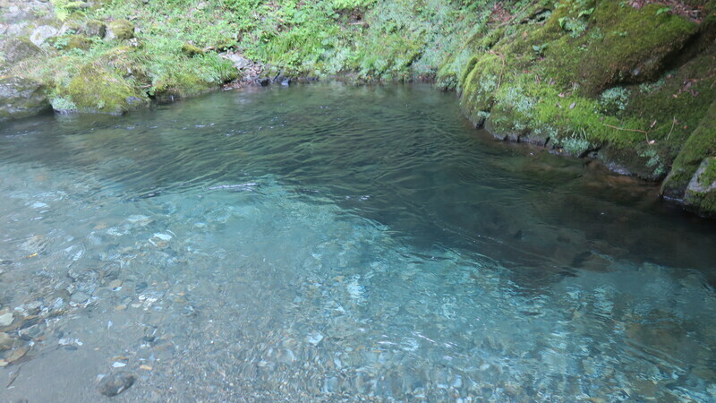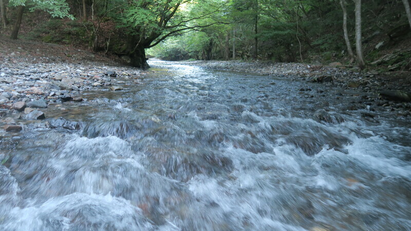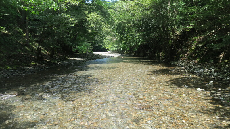 川は浅いが、岩の奥には淵もある。自分の腹から胸まで水深がありそう。