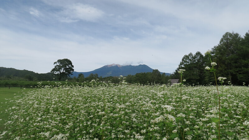蕎麦の花と御嶽山。山はもう雲に隠れつつある。