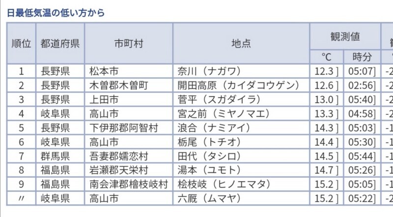 今回の最低気温に載りませんでしたが、長野の野辺山という場所も