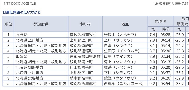真夏の頃はあまりランク入りしていなかった野辺山が、最低気温1位を連続記録。