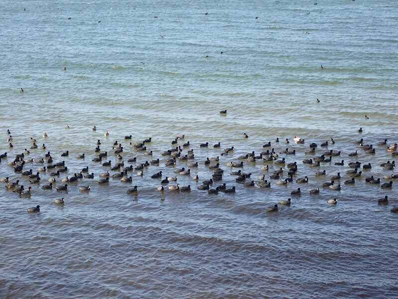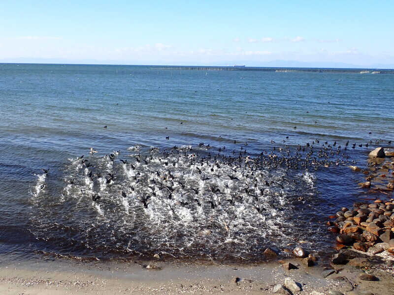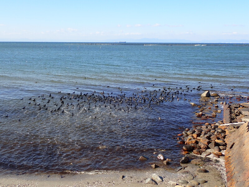 海藻なのか海が黒い・・ こいつらの餌場だったか!?