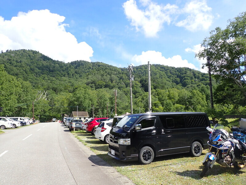 薬師岳登山口でもある駐車場は満車でしたが、いい場所が空いてました!